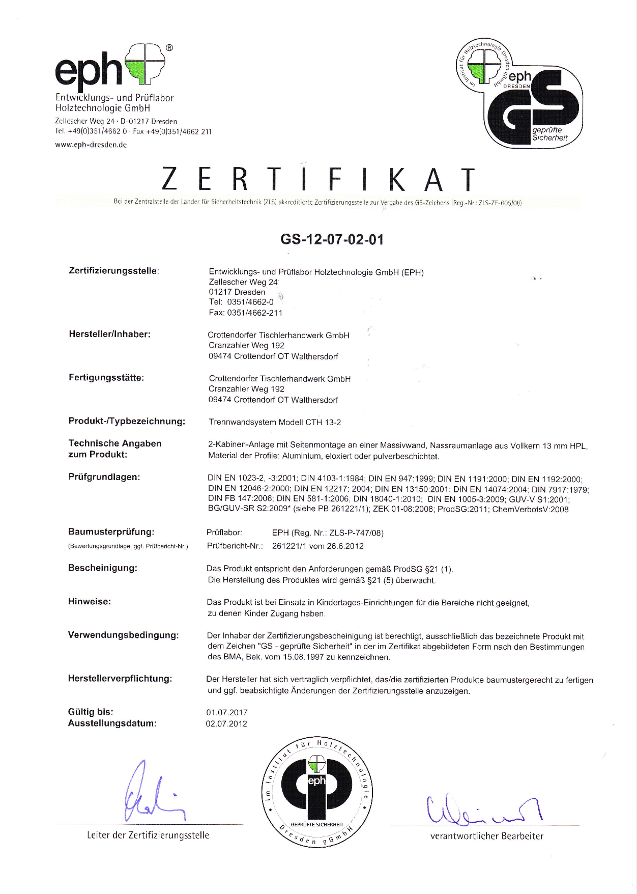 Níže uvedený certifikát se vztahuje k dělícímu systému CTH 13-2.
